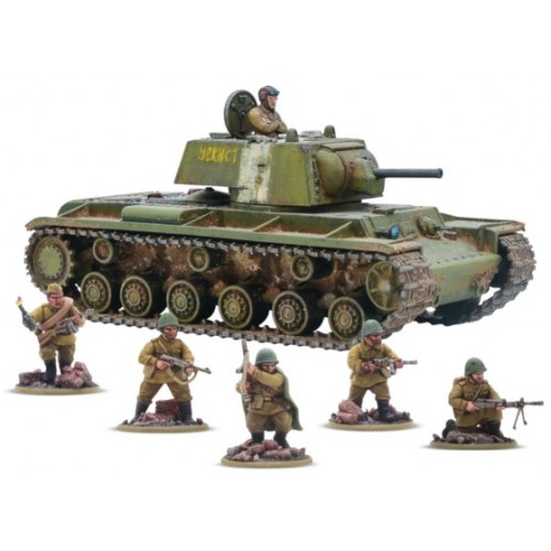 La boîte contient également une grappe d'infanterie soviétique en plastique prête à représenter une escouade de Tank Riders (Armies of the Soviet Union, page 35), une petite escouade de cinq hommes armés de mitraillettes qui peuvent s'approprier le KV comme un transport improvisé !
