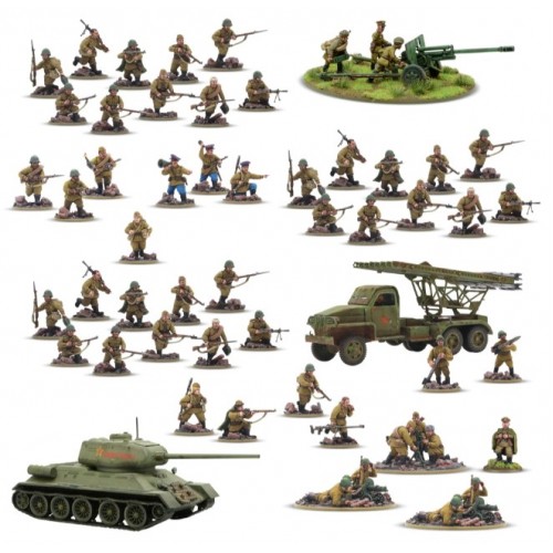 Parfaite pour représenter les grandes offensives soviétiques qui ont contribué à mettre fin à la guerre en Europe, cette armée de départ vous offre tout ce dont vous avez besoin pour déployer une force puissante sur la table de Bolt Action. Au cœur de celle-ci se trouvent 42 fantassins en plastique, vous permettant de constituer un peloton de fusiliers rempli d'une grande variété d'escouades d'infanterie et d'équipes d'armes, ainsi que tous les commandants de peloton nécessaires à votre force. En soutien à l'infanterie, un peloton d'artillerie avec un canon divisional ZiS-3, un peloton d'armes lourdes composé de deux équipes de mitrailleuses légères et d'un mortier moyen, avec leur propre commandant de peloton en résine Warlord, ainsi qu'un peloton blindé avec un T-34/85 percutant et un lance-roquettes Katyusha.