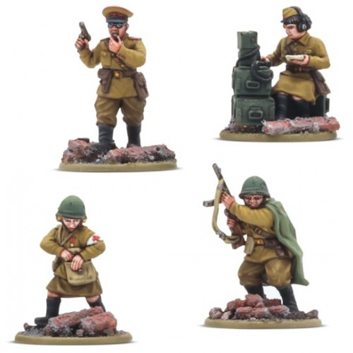 Contient quatre figurines de QG de l'Armée soviétique, en résine Warlord, avec des bases en plastique.