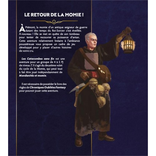 Prolongez la Campagne du Cycle de la Momie avec Les Catacombes sans fin, module pour niveaux 7 dans lequel la momie se met en quête de son tombeau !