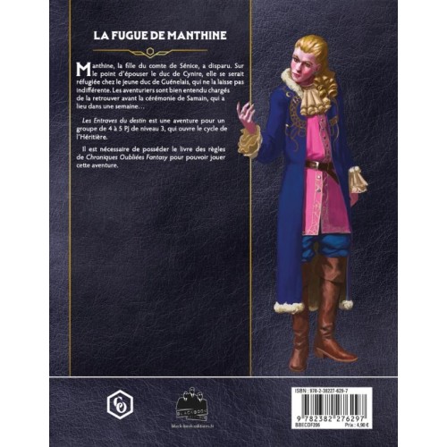 Manthine, la fille du comte de Sénice, a disparu. Sur le point d’épouser le duc de Cynire, elle se serait réfugiée chez le jeune duc de Guénelais, qui ne la laisse pas indifférente. Les aventuriers sont bien entendu chargés de la retrouver avant la cérémonie de Samain, qui a lieu dans une semaine… Les Entraves du destin est une aventure pour un groupe de 4 à 5 PJ de niveau 3, qui ouvre le cycle de l’Héritière.