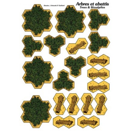 Formes à découper imprimées sur papier fort A4 représentant des arbres et des tas de bois, pour agrémenter des scénarios.