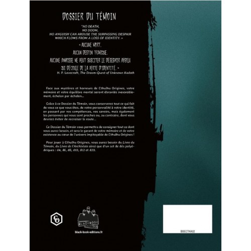 Ce Dossier du Témoin vous permettra de consigner tout ce dont vous aurez besoin, et sera le garant de votre mémoire et de votre existence au cœur de l’univers impitoyable de Cthulhu Origines !