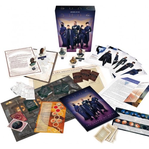 Cette boîte contient un livret d’aventure de 116 pages, offrant des conseils et des explications pas à pas, à mesure que vous jouez ; cinq livrets de personnage présentant les membres de la Maison Nagara ; deux decks de 50 cartes détaillant les personnages non joueurs, les atouts et les traits utilisés dans le cadre de cette aventure ; trois aides de jeu et quatre cartes des zones pour vous permettre de donner vie à Arrakis à votre table ; cinquante-quatre jetons et deux marqueurs pour les réserves d’Impulsion, de Menace et de Détermination ; un système de simulation des opérations d’épiçage capable de restituer vos réussites et vos revers dans la gouvernance d’Arrakis.