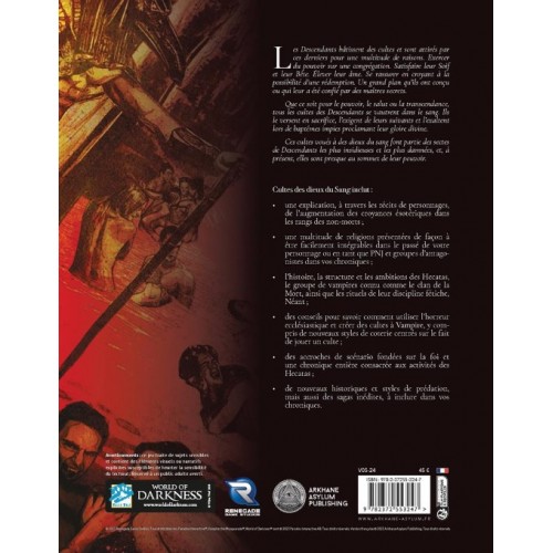 Loin d’adhérer aux règles de la Camarilla, il est des vampires qui adhèrent ou fondent des cultes aux ‘dieux’ du sang ! Que ce soit pour nourrir leur Bête ou satisfaire leur inextinguible soif, ils exigent du sang, qu’il soit issu de sacrifices ou de leurs suivants. Les sectes du sang des Descendants sont les plus abjectes du monde de la nuit.