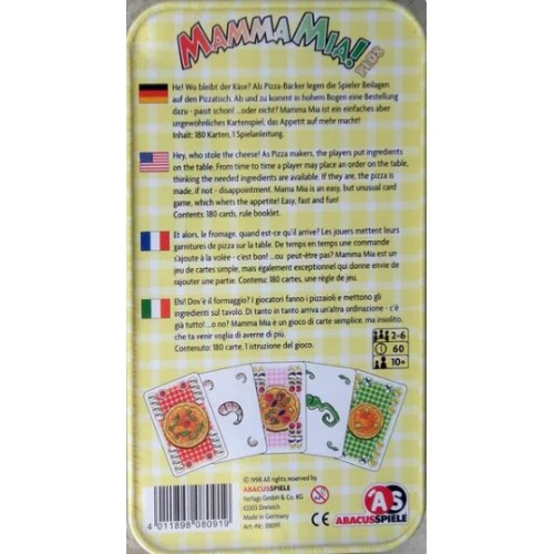 A l'occasion des 10 ans de Mamma Mia! Le jeu est publié sous forme d’édition spéciale dans une boîte en métal robuste. Cette nouvelle édition remaniée du populaire jeu de pizza peut accueillir jusqu'à 6 joueurs ! Parmi les 180 cartes, il y a un nouvel ingrédient, de nombreuses nouvelles commandes et un jeu supplémentaire pour le sixième joueur. Idéal aussi bien pour les débutants que pour les vieux fans de Mamma Mia!