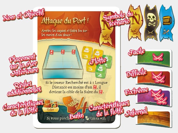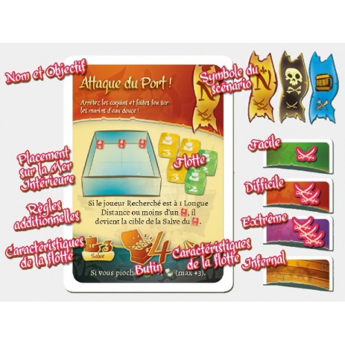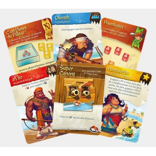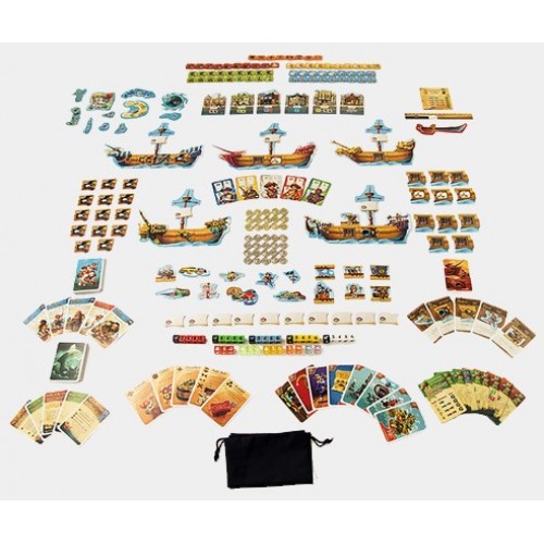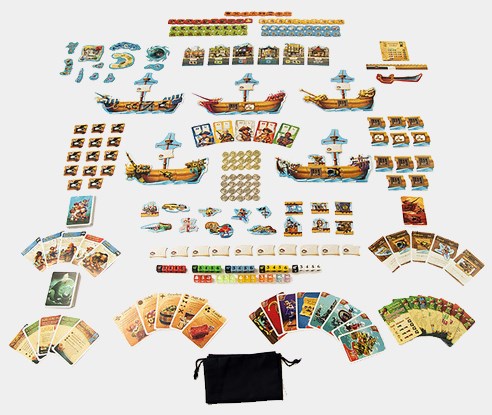 Proche de la mer se trouvent les différents plateaux du port, qui compte un Marché, une Taverne, un Chantier Naval, un Atelier, un Caveau et un siège de Guilde. Une carte Aventure, tirée à chaque tour, indique l’objectif, la difficulté, le placement de la flotte, etc. La partie commence...