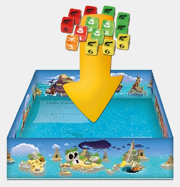 On commence par placer le fond de la boite au centre de la table, c’est la mer. Ensuite, chaque joueur reçoit son kit de pirate, composé des trois parties de son bateau et de ses navires... des dés !