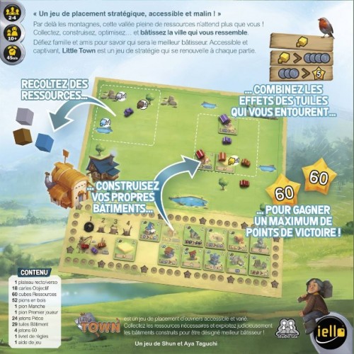 Little Town est un jeu de stratégie et de placement d’ouvriers accessible et malin, destiné à être joué en famille et entre amis. Simple à prendre en main, sa profondeur permet à chacun de développer rapidement son propre style de jeu.