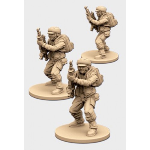 3 figurines en plastique, 1 feuillet de règles, 3 cartes Déploiement, 1 carte État, 3 cartes Commandement, 1 carte Mission Annexe, 2 cartes Mission d’escarmouche, 4 pions d’Identification et 12 autocollants d’Identification.