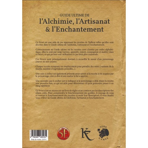 Contrairement au Guide ultime de l’alchimie, l’artisanat et l’enchantement où les recettes sont classées par ordre alphabétique, elles le sont ici par rang (novice, apprenti, expert, compagnon et maître) dans ces livrets, ce qui permet une utilisation en jeu bien plus commode.