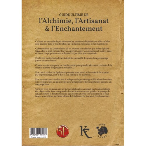 Contrairement au Guide ultime de l’alchimie, l’artisanat et l’enchantement où les recettes sont classées par ordre alphabétique, elles le sont ici par rang (novice, apprenti, expert, compagnon et maître) dans ces livrets, ce qui permet une utilisation en jeu bien plus commode.