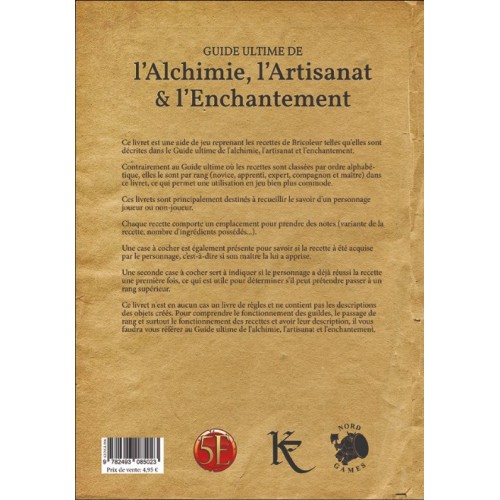 Contrairement au Guide ultime de l’alchimie, l’artisanat et l’enchantement où les recettes sont classées par ordre alphabétique, elles le sont ici par rang (novice, apprenti, expert, compagnon et maître) dans ces livrets, ce qui permet une utilisation en jeu bien plus commode.