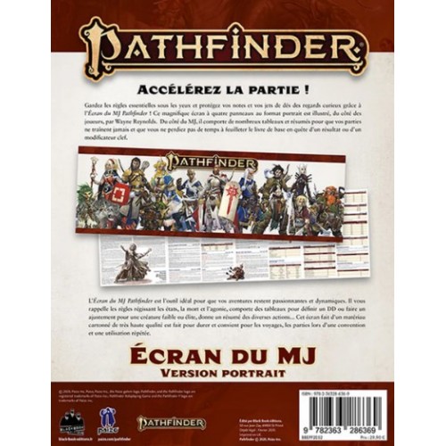 Gardez les règles essentielles sous les yeux et protégez vos notes et vos jets de dés des regards curieux grâce à l’Écran du MJ Pathfinder ! Ce magnifique écran à quatre panneaux au format paysage est illustré, du côté des joueurs, par Ekaterina Burmak. Du côté du MJ, il comporte de nombreux tableaux et résumés pour que vos parties ne traînent jamais et que vous ne perdiez pas de temps à feuilleter le livre de base en quête d’un résultat ou d’un modificateur clef.