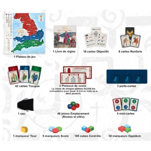 Rex Britannorum est un jeu de stratégie et de placement jouable en solo, à 2 ou à 3 joueurs. La victoire s’obtient en occupant les routes et les cités dans les différentes régions de Britannia représentées sur le plateau de jeu. De plus, chaque joueur aura deux objectifs personnels à réaliser qui lui permettront de gagner des points de victoire supplémentaires.