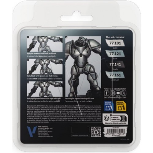 Le kit Vallejo True Metallic Metal 251 "Sterling Silver" comprend quatre peintures acryliques de 18 ml chacune, spécialement conçues pour reproduire avec précision des surfaces métalliques avec un brillant naturel et des reflets réalistes de la lumière.