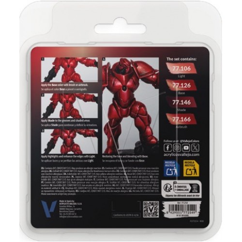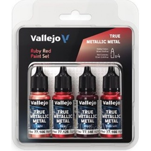 Le kit Vallejo True Metallic Metal 254 "Ruby Red" comprend quatre peintures acryliques de 18 ml chacune, spécialement conçues pour reproduire avec précision des surfaces métalliques avec un brillant naturel et des reflets réalistes de la lumière.