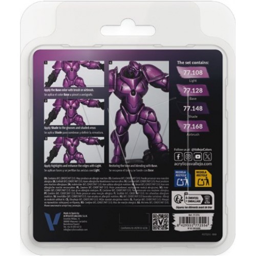 Le kit Vallejo True Metallic Metal 255 "Amethyst Purple" comprend quatre peintures acryliques de 18 ml chacune, spécialement conçues pour reproduire avec précision des surfaces métalliques avec un brillant naturel et des reflets réalistes de la lumière.