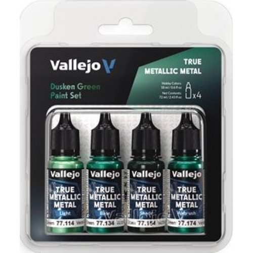 Le kit Vallejo True Metallic Metal 257 "Dusken Green" comprend quatre peintures acryliques de 18 ml chacune, spécialement conçues pour reproduire avec précision des surfaces métalliques avec un brillant naturel et des reflets réalistes de la lumière.
