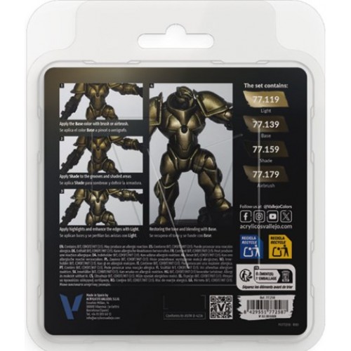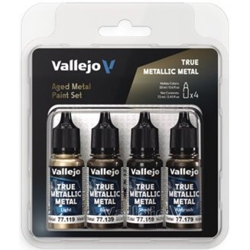 Le kit Vallejo True Metallic Metal 258 "Aged Metal" comprend quatre peintures acryliques de 18 ml chacune, spécialement conçues pour reproduire avec précision des surfaces métalliques avec un brillant naturel et des reflets réalistes de la lumière.