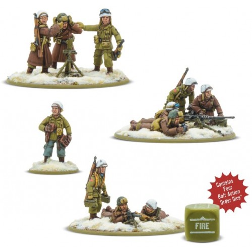 La boîte contient un officier Warlord Resin US Airborne (hiver), une mitrailleuse moyenne en métal avec trois équipages Warlord Resin US Airborne (hiver), une mitrailleuse lourde en métal avec quatre équipages Warlord Resin US Airborne (hiver) et un mortier moyen en métal avec trois équipages Warlord Resin US Airborne (hiver). Contient également quatre dés d'ordre Bolt Action et des bases en plastique.