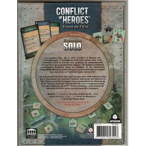 Après plus de trois ans de développement, Conflict of Heroes: Eastern Front - Solo Expansion est une extension solitaire pour Conflict of Heroes: Le réveil de l'Ours. Au lieu que les unités IA soient programmées individuellement comme dans certains jeux précédents, les unités IA utilisent un comportement émergent unique et une logique basée sur des agents. Chaque situation est évaluée et l'IA met en œuvre le meilleur cours d'action en utilisant les ressources disponibles et les atouts des unités. Même les joueurs vétérans de CoH seront mis au défi d'affiner et d'adapter leur style de jeu pour surmonter l'IA !