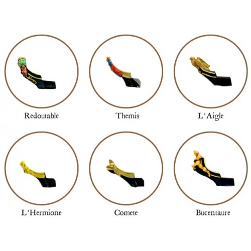 Une sélection de figureheads et de plaques arrière en métal pour créer des navires célèbres de la Marine française :