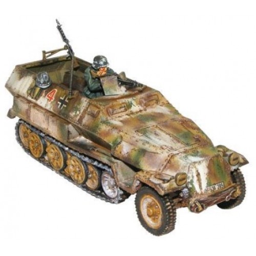 La boîte contient 1 half-track en plastique, un dépliant, une carte de statistiques Bolt Action, des marqueurs de dommages au véhicule et une feuille de décalcomanies.