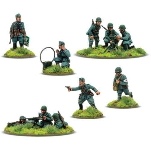 Contient les figurines en métal suivantes qui peuvent être déployées en tant que troupes de l'armée italienne ou des chemises noires :
