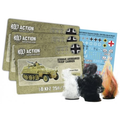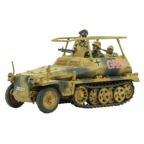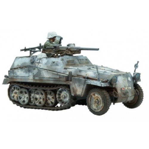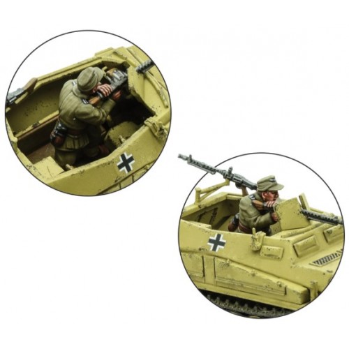 Le Sd.Kfz 250/1 était un half-track de reconnaissance et de transport principalement utilisé par les unités de reconnaissance et de QG. Le véhicule était une version raccourcie de la série omniprésente Sd.Kfz 251 Hanomag et, tout comme son cousin plus long, il existait de nombreuses variantes remplissant différents rôles, tels que les porte-câbles, les porte-munitions et les porte-radio, entre autres. Il transportait six hommes, dont le conducteur et le copilote, et était armé de deux mitrailleuses MG34 montées sur pivot, l'une blindée tournée vers l'avant et l'autre couvrant l'arrière et l'air.
