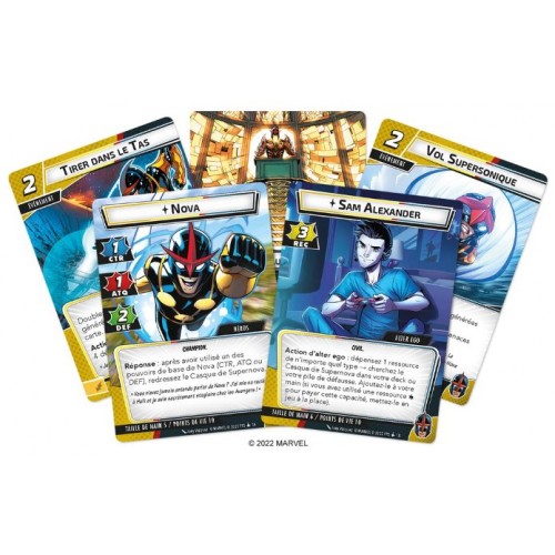 Deck Agressivité : Les pouvoirs de Nova proviennent de son Casque de Supernova, une partie d’un équipement cosmique qui lui confère une force surhumaine, la capacité de voler à très grande vitesse et de manipuler l’énergie. Utilisez le Casque de Supernova pour renforcer plusieurs événements. Vous pouvez, par exemple, Tirer dans le Tas pour atomiser un ennemi, ou utiliser une Projection de Champ de Force pour renvoyer les dégâts à cet ennemi. Nova peut également se connecter au Wolrdmind Xandarien via son casque pour augmenter ses capacités ou passer sous forme d’alter ego et demander de l’aide à son père, qui fut autrefois Nova avant Sam.