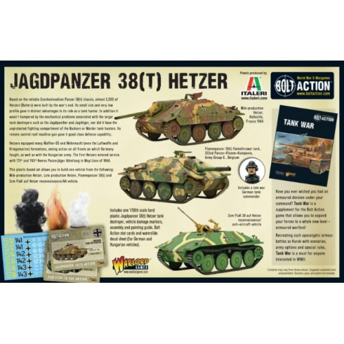 Inclut : un chasseur de chars Jagdpanzer 38(t) Hetzer en plastique dur à l'échelle 1/56ème, des marqueurs de dégâts de véhicule, un guide d'assemblage et de peinture en couleur, des cartes de statistiques Bolt Action et une feuille de décalcomanies (pour les véhicules allemands et hongrois).