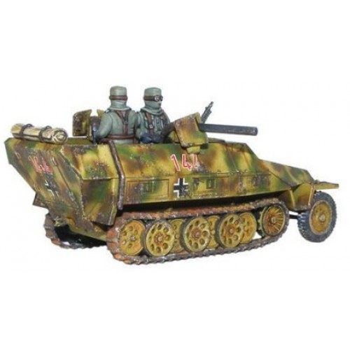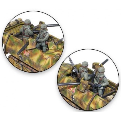 La boîte contient 1 half-track en plastique, un dépliant, une feuille de décalcomanies, une carte de statistiques Bolt Action et des marqueurs de dommages au véhicule.