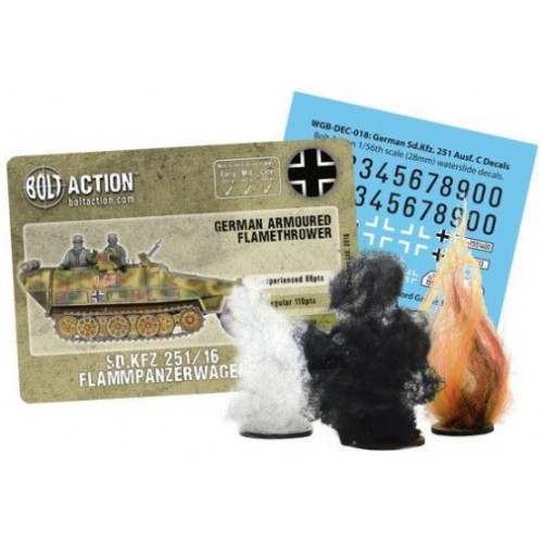 Une conversion du SdKfz 251/1 AusfD avec deux projecteurs de flammes montés sur les côtés désignés 251/16. Les 2 principaux projecteurs de flammes étaient soutenus par les MG34 ou MG42 habituelles montés sur le bouclier et un lance-flammes portatif supplémentaire (bien que toujours attaché par un tuyau à la demi-chenille) de plus petit calibre qui pouvait être utilisé par l'infanterie débarquée. L'équipage enfilait un casque de protection allant des cagoules complètes aux écharpes lourdes et aux lunettes de protection. Beaucoup d'opportunités de conversion ici!