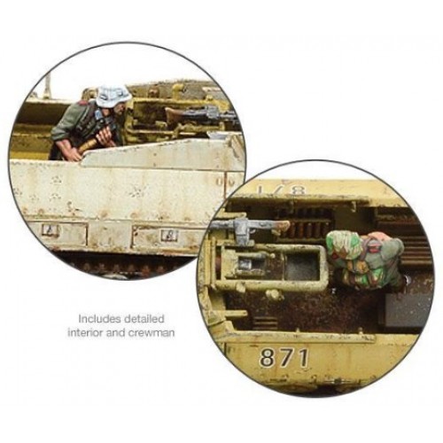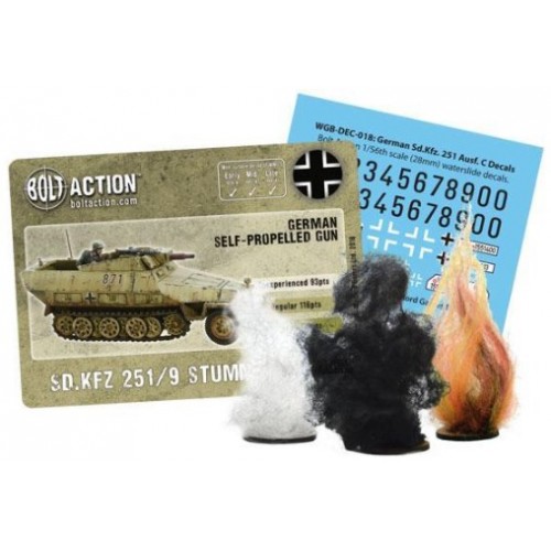 La boîte contient 1 half-track en plastique, un dépliant, une feuille de décalcomanies, une carte de statistiques Bolt Action et des marqueurs de dommages au véhicule.