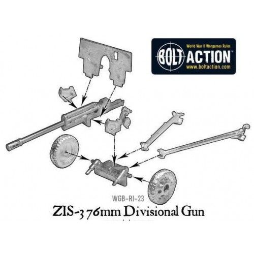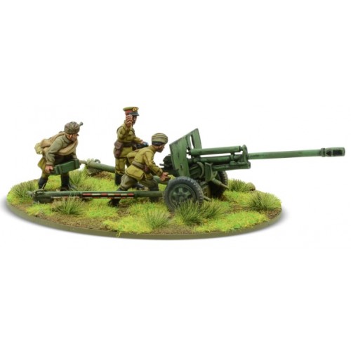 Pièce d'artillerie soviétique classique, le canon divisionnaire ZIS3 de 76 mm, le commandant et deux figurines d'équipage. Ce canon a été fabriqué par milliers et peut être utilisé dans des rôles de soutien d'artillerie ou antichar.