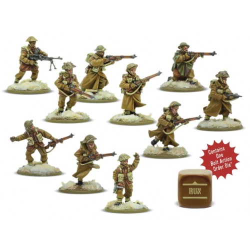 Contient 10 figurines en métal - 1 sous-officier avec SMG, une équipe de 2 Bren Gun LMG, 1 fantassin avec SMG et 6 fantassins avec des fusils, des socles en plastique et 1 dé d'ordre Bolt Action.